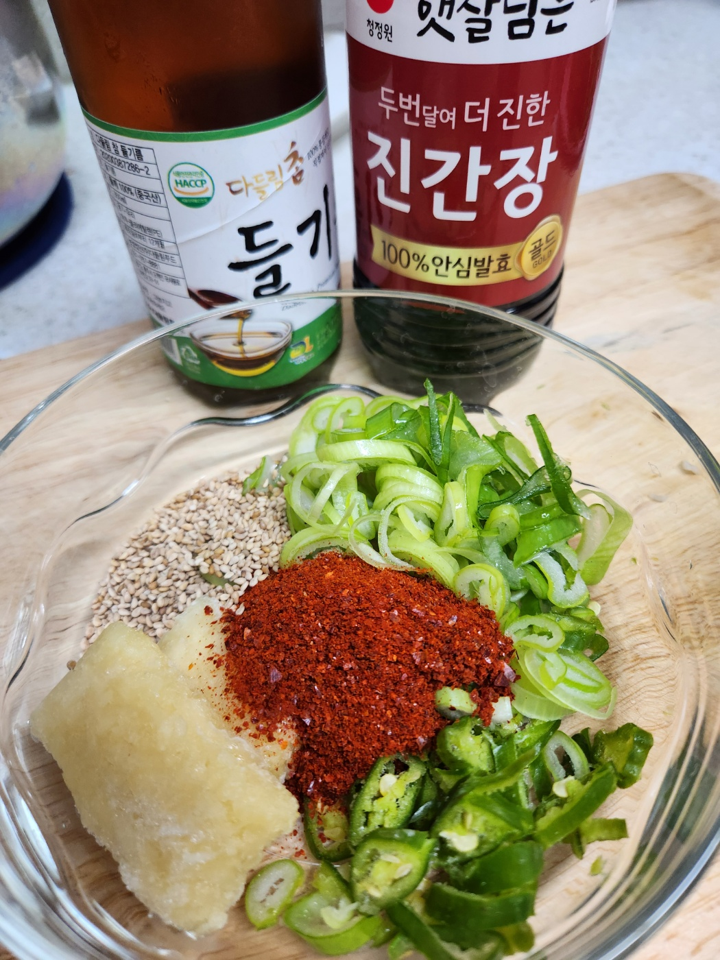 볼에 진간장, 들기름, 다진 마늘, 고춧가루를 넣고 잘 섞어주세요.